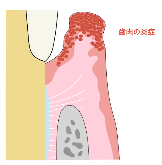 一般的に歯肉炎と言われる状態です。歯の汚れである歯垢の中の細菌によって歯肉にん起こる炎症のことです。歯周炎の前段階とされています。症状としては歯肉の色調がピンク色から赤色になり、歯肉の腫れ、歯肉溝(歯と歯肉の間の溝)からの出血、痛みなどがみられます。レントゲンでは異常はみられませんが、歯と歯肉の間の溝を測る歯周ポケットの検査では歯肉の腫れにより深い溝ができ、歯肉溝からの出血がみられます。また、炎症のおきている歯肉は健康な歯肉とは見た目が変化していて赤くブヨブヨしていることが多くみられます。思春期、妊娠などの特定の時期におこりやすいとも言われ、糖尿病や白血病、栄養不足などによっても同様に健常なかたより歯肉炎になりやすいといわれています。